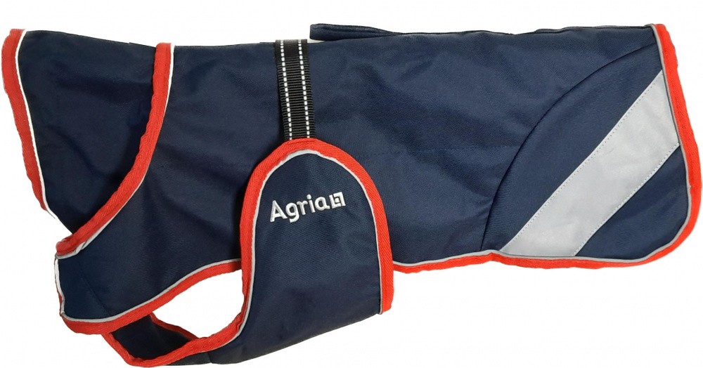 Hundedækken med ydermateriale i 600D Ripstop, vind- og vandtæt. Foret med Agria mønstret fleece. Justerbare velcrostropper foran og under maven. Hul til kobbel, bagbensstropper. Størrelse 30-70 cm.